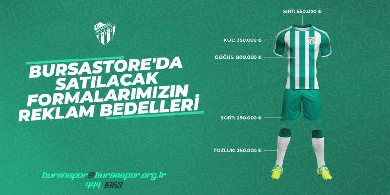 Yönetim Kurulumuzun almış olduğu karar doğrultusunda 2021-2022 sezonunda Bursastore Mağazalarımızda satışa sunulacak formalarımızın sezonluk reklam alanlarının (göğüs, sırt, kol ve şort) bedelleri şu şekildedir.
